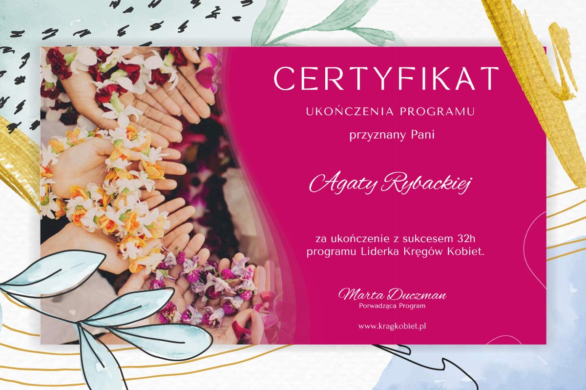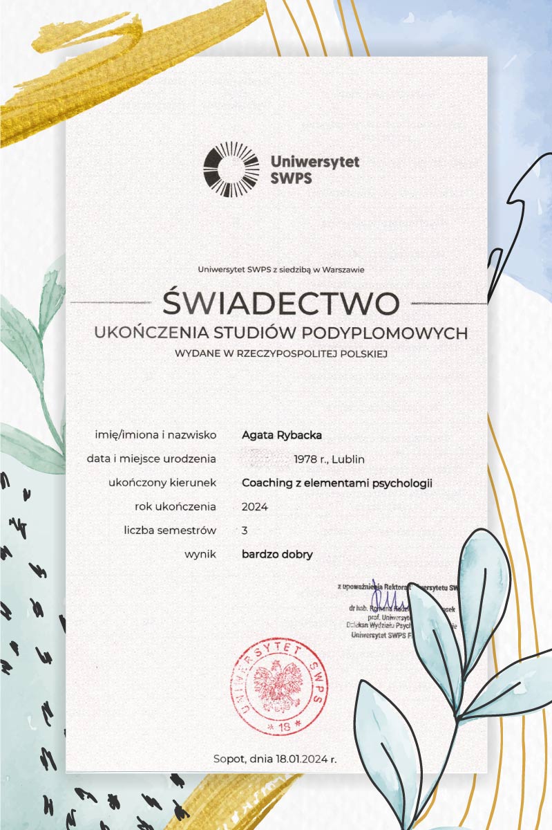Skończyłam prawo, a dwadzieścia lat później studia podyplomowe z Coachingu z elementami Psychologii. Przeprowadziłam dziesiątki sesji indywidualnych w obszarze zarządzania sobą w czasie, asertywności, motywacji, relacji, wyznaczania celów. Pracuję metodą dialogu terapeutycznego w nurcie psychologii jungowskiej. Regularnie prowadzę sesje coachingowe, szkolenia firmowe i spotkania rozwojowe w formie kobiecych kręgów.